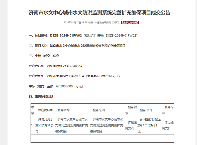 濟(jì)南市水文中心城市水文防洪監(jiān)測(cè)系統(tǒng)完善擴(kuò)充維保項(xiàng)目,項(xiàng)目金額67.2萬(wàn)元,主要服務(wù)內(nèi)容為濟(jì)南市城市水文防洪監(jiān)測(cè)系統(tǒng)完善擴(kuò)充項(xiàng)目已建站點(diǎn)的日常運(yùn)行維護(hù)、保養(yǎng)、檢修,保障自動(dòng)測(cè)報(bào)設(shè)備正常運(yùn)行,使信息化平臺(tái)更好服務(wù)于防汛監(jiān)測(cè)和指揮調(diào)度。