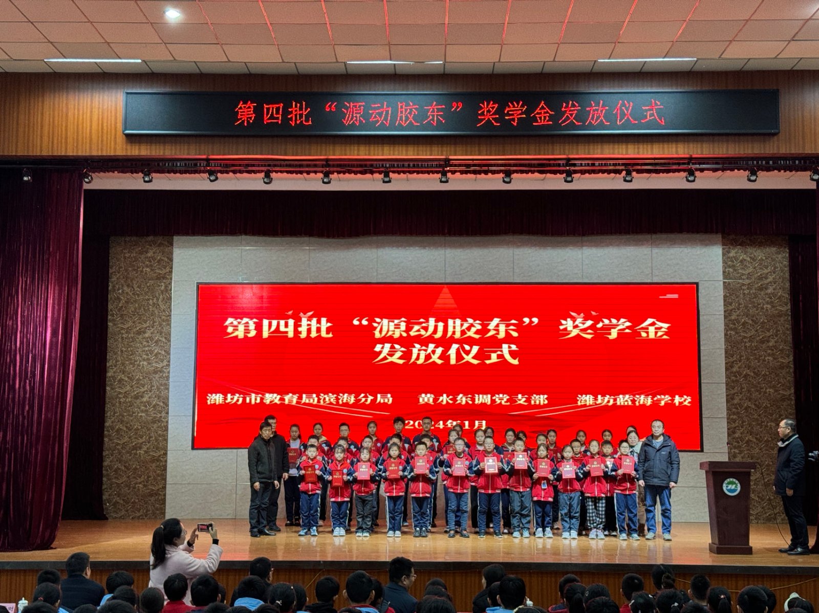 1月17日下午,黃水東調(diào)黨支部聯(lián)合濰坊藍(lán)海學(xué)校在藍(lán)海學(xué)校行政樓報告廳舉行了第四批“源動膠東”獎學(xué)金頒發(fā)儀式,對藍(lán)海學(xué)校2023學(xué)年榮獲獎學(xué)金的42名優(yōu)秀學(xué)生進行表彰。濱海區(qū)教育分局黨組成員、副局長袁玉松,山東水發(fā)黃水東調(diào)工程有限公司黨支部書記、董事長申勇,總經(jīng)理宋致軍,濰坊藍(lán)海學(xué)校黨支部書記、校長楊偉平等出席,共計300余名師生參加此次活動。